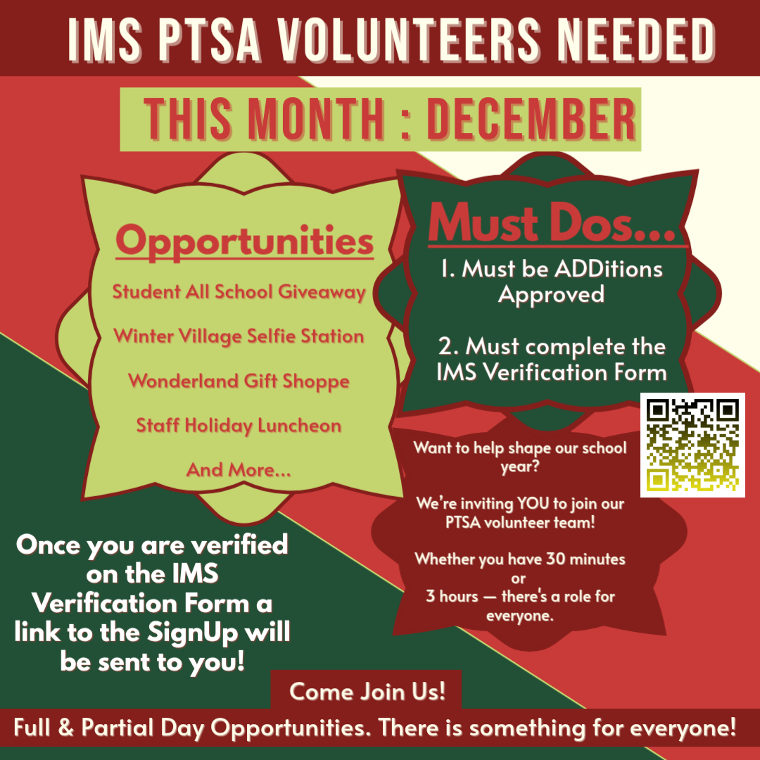 | Student All School Giveaway Assistance | Various Days in December | Email president@innovationmiddleptsa.org | president@innovationmiddleptsa.org |