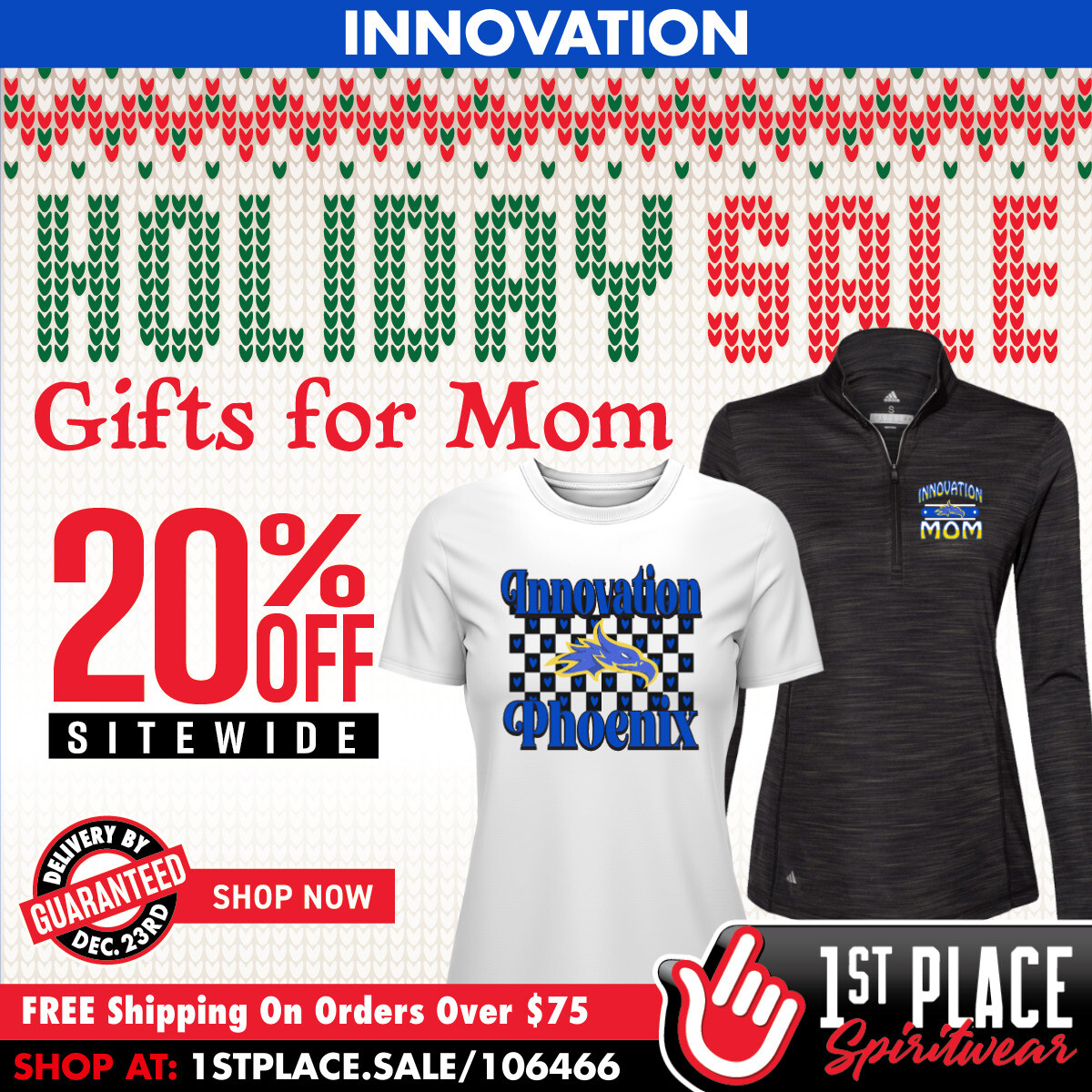 Take 20% off sitewide with FREE SHIPPING on orders over $75! Shop from hoodies, shirts, hats, and more! Order your custom Innovation gifts now with guaranteed delivery by December 23rd!